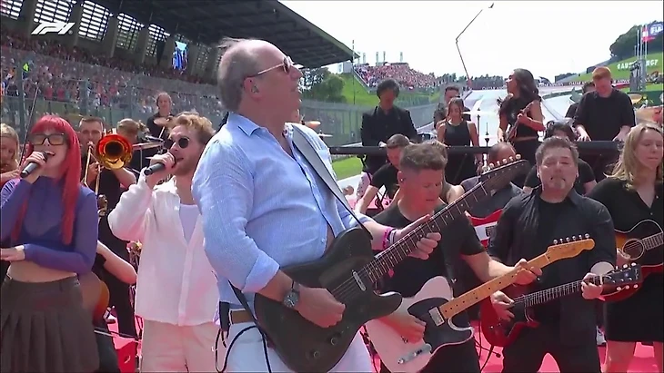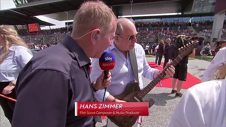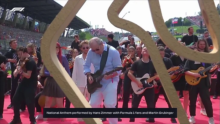 На стартовой решетке Мартин Брандл во время своего традиционного обхода обнаружил знаменитого композитора Ханса Циммера. Который пришел не просто так - и для процедуры исполнения национального гимна. Мощный заход однако.