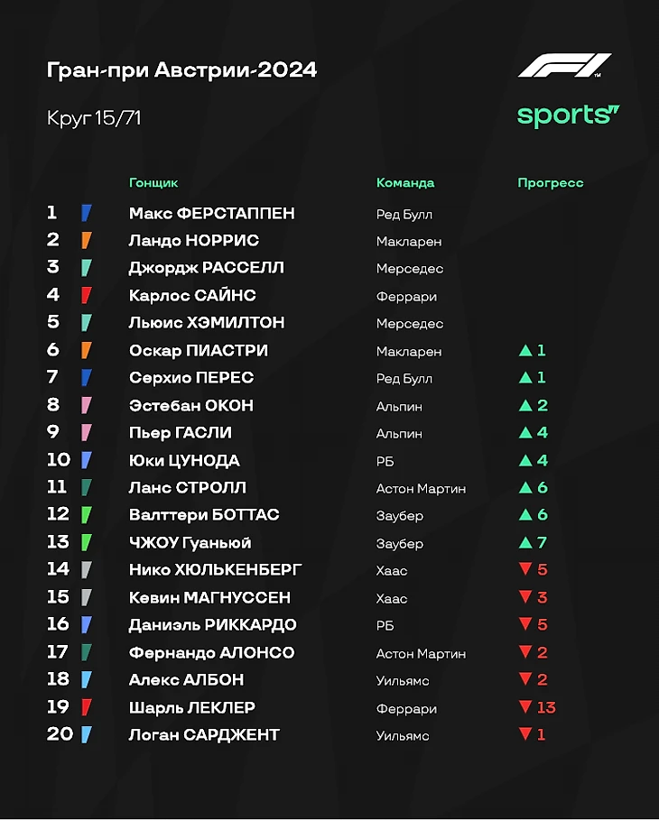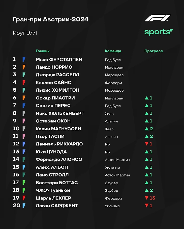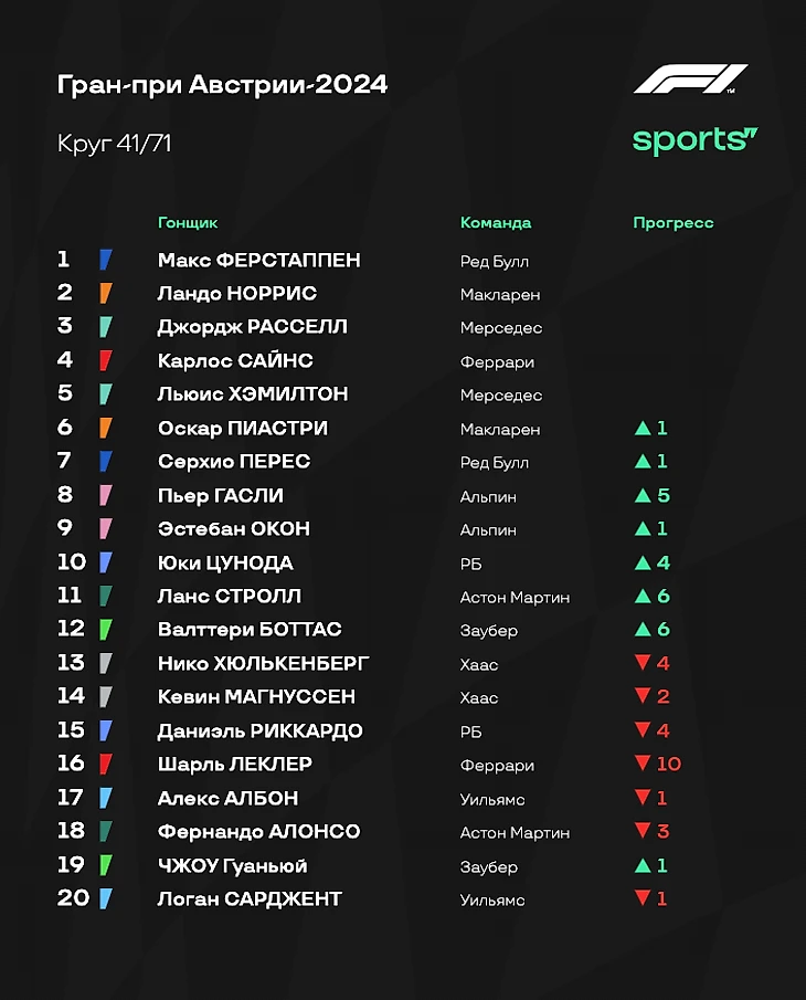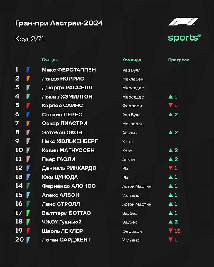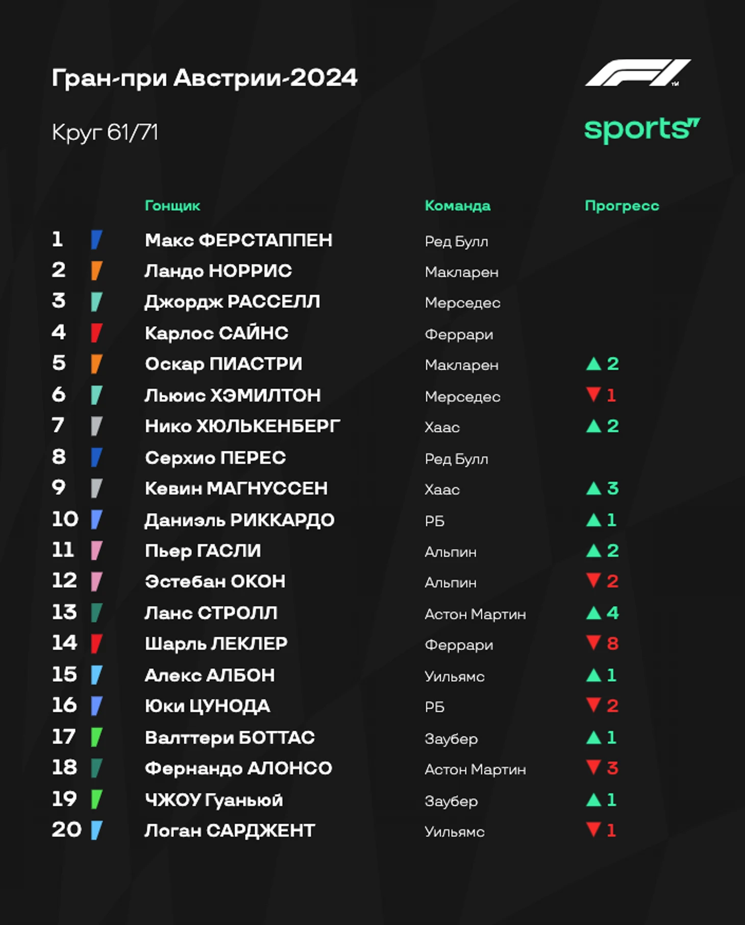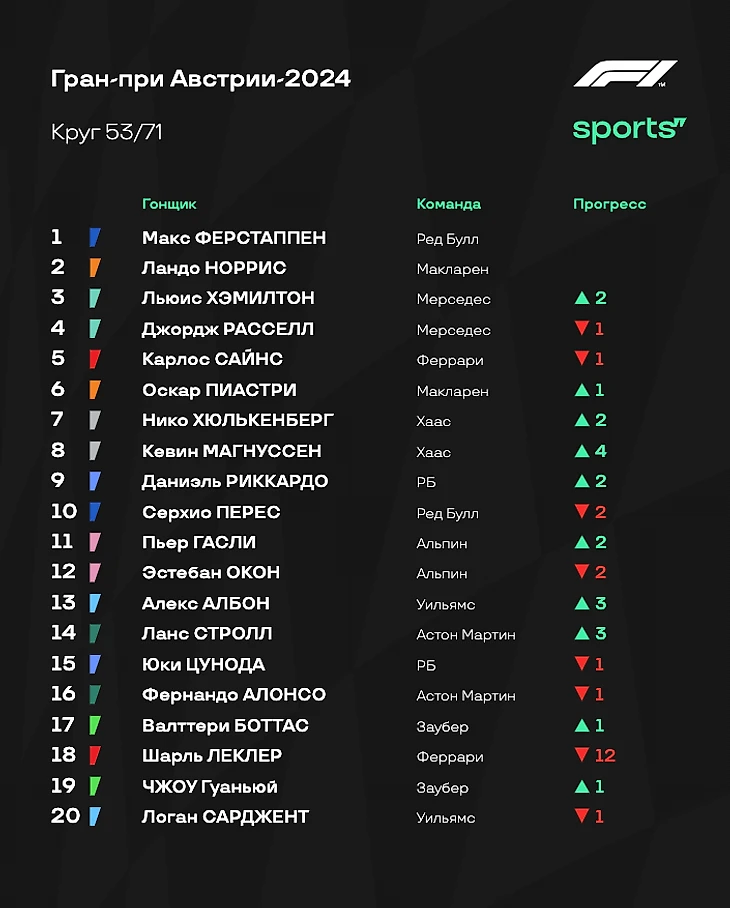 Чуть позади Перес отыграл две позиции, а Леклер и Пиастри откатились на 7-8 позиции.