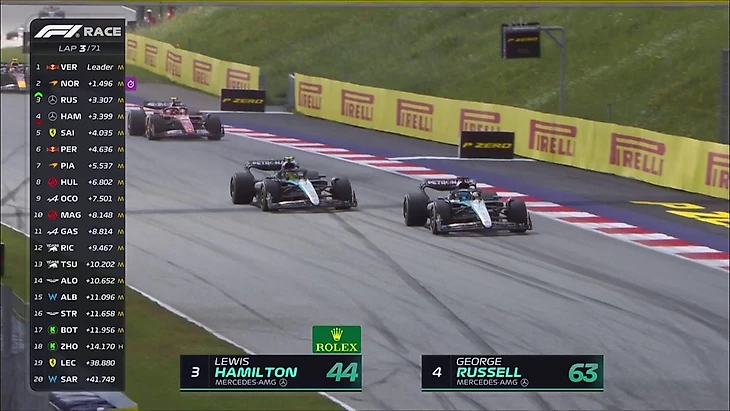 Макс к 3-му кругу уехал от Норриса почти на 2 секунды. Расселл тоже отстал от Норриса - ибо вынужден отбиваться от атак Хэмилтона. Сайнс тоже рядом.