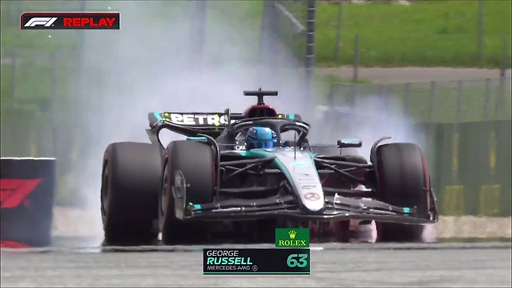 Упс...Джордж на круге выезда из боксов схватил блокировку колес и прокатился по зоне безопасности. Но вроде ничего серьезного.