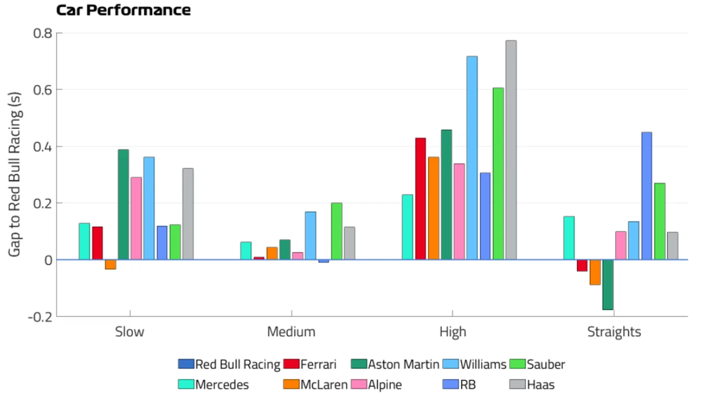 Тем не менее, «Мерседес» все еще планировал биться за подиум, а «Макларен» не сбрасывал в свою очередь не отказывался от надежд сразиться с Ферстаппеном за победу. Общий уровень топовых машин же показывал большое преимущество чемпионов именно в быстрых связках – с большим требованием к прижимной силе, механическому сцеплению и контролю над износом шин: