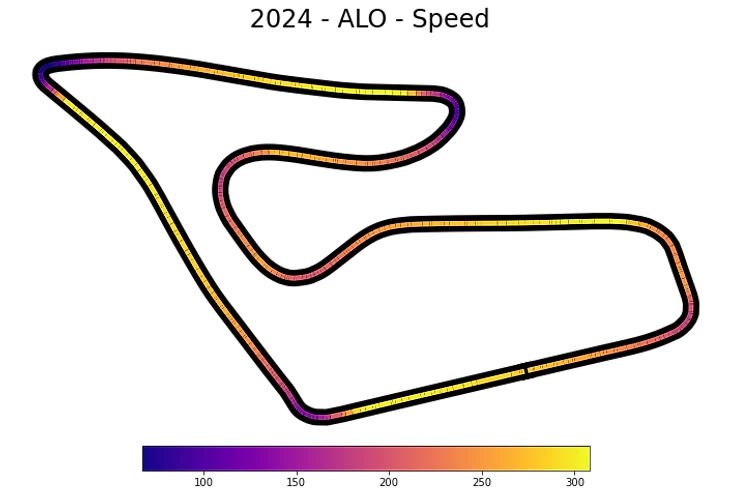 Визуализируем распределение скорости Фернандо Алонсо, установившего быстрейший круг на Гран-при Австрии, на этом самом круге.