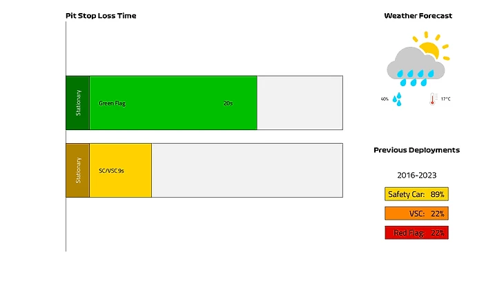 Но погода и вероятность автомобиля безопасности все равно могли все перевернуть в одну секунду: всего 17 градусов по прогнозу, от 40 до 60% вероятности дождя (из вариантов – и легкий душ, и бурный Апокалипсис) и целых 89% на сэйфти-кар трудно игнорировать. Стратегическим штабам точно требовалось заготовить кучу альтернатив.
