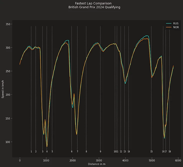 По оси у- отложена скорость каждого гонщика, по оси х - отложена дистанция трассы. Вертикальными линиями показаны номера соответствующих поворотов. Оранжевым цветом показан график скорости - Ландо Норриса, а бирюзовым соответственно Джорджа Расселла.