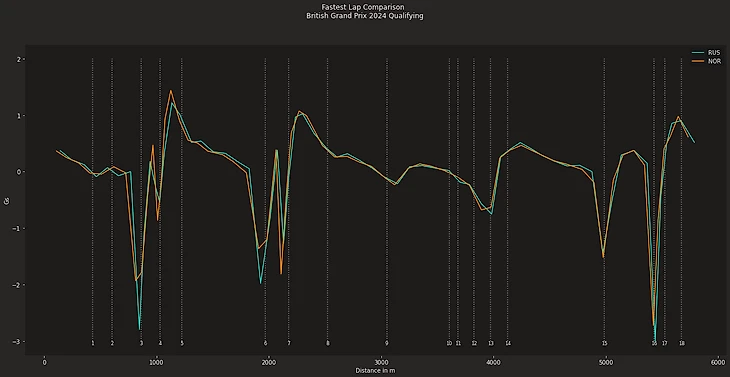 По оси у показана перегрузка, которую испытывал (в g), каждый гонщик, по оси х - отложена дистанция трассы. Вертикальными линиями показаны номера соответствующих поворотов. Оранжевым цветом показан график - Ландо Норриса, а бирюзовым соответственно Джорджа Рассела.