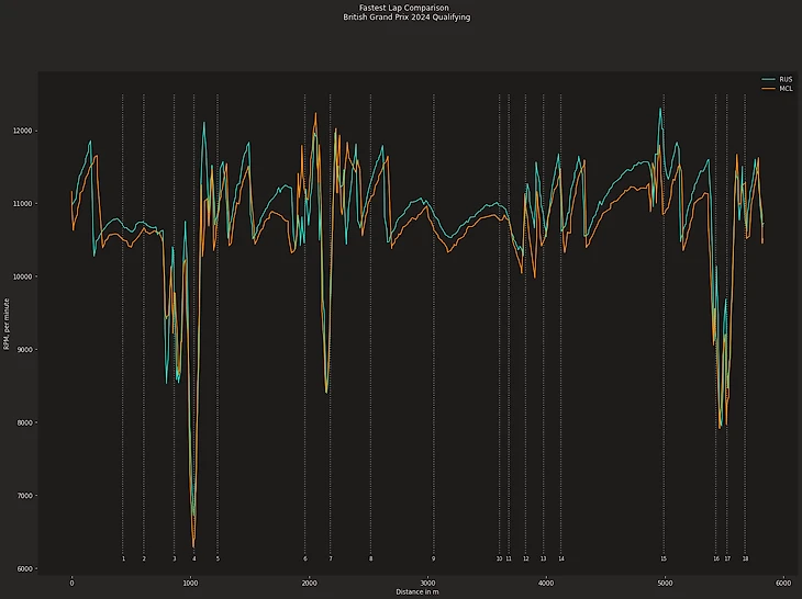 По оси у- отложены обороты которые развивал двигатель каждого гонщика, по оси х - отложена дистанция трассы. Вертикальными линиями показаны номера соответствующих поворотов. Оранжевым цветом показан график - Ландо Норриса, а бирюзовым соответственно Джорджа Расселла.