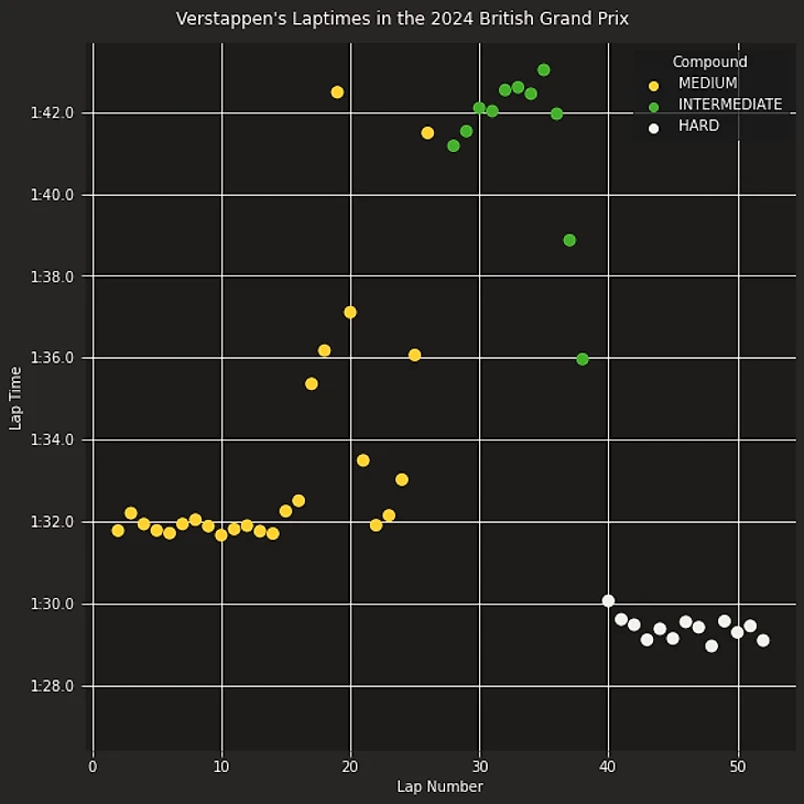 По оси х отложены круги гонки, по у - время гонщика. Цвет кружочка отражает типы шины: желтый - медиум, белые - хард, красный - софт, зеленый -промежуточные.