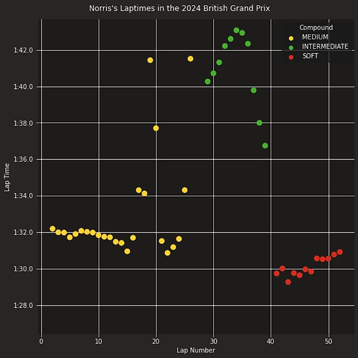 Нанесем на график время прохождения круга призеров Гран-при Англии 2024 Льюиса Хэмильтона (победителя), Макса Ферстаппена (занявшего второе место) и Ландо Норриса (занявшего третье место) в гонке с учетом типа шин.