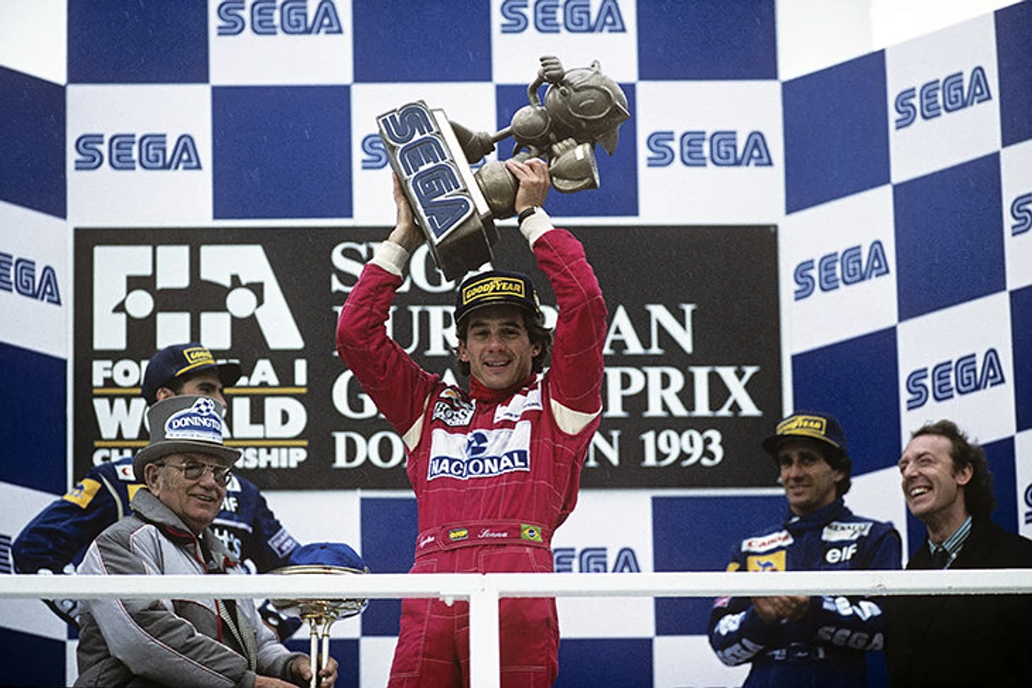 А это, пожалуй, один из самых знаменитых трофеев в истории «Формулы-1». Наверняка, каждый из вас хотя бы разок натыкался на знаменитое фото Айртона Сенный с Соником в руках.