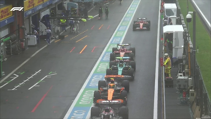 Стартовал первый сегмент квалификации. Пилоты ринулись на трассу, попутно устроив небольшую пробку на выезде с пит-лейн. Все на промежуточных шинах, разумеется.