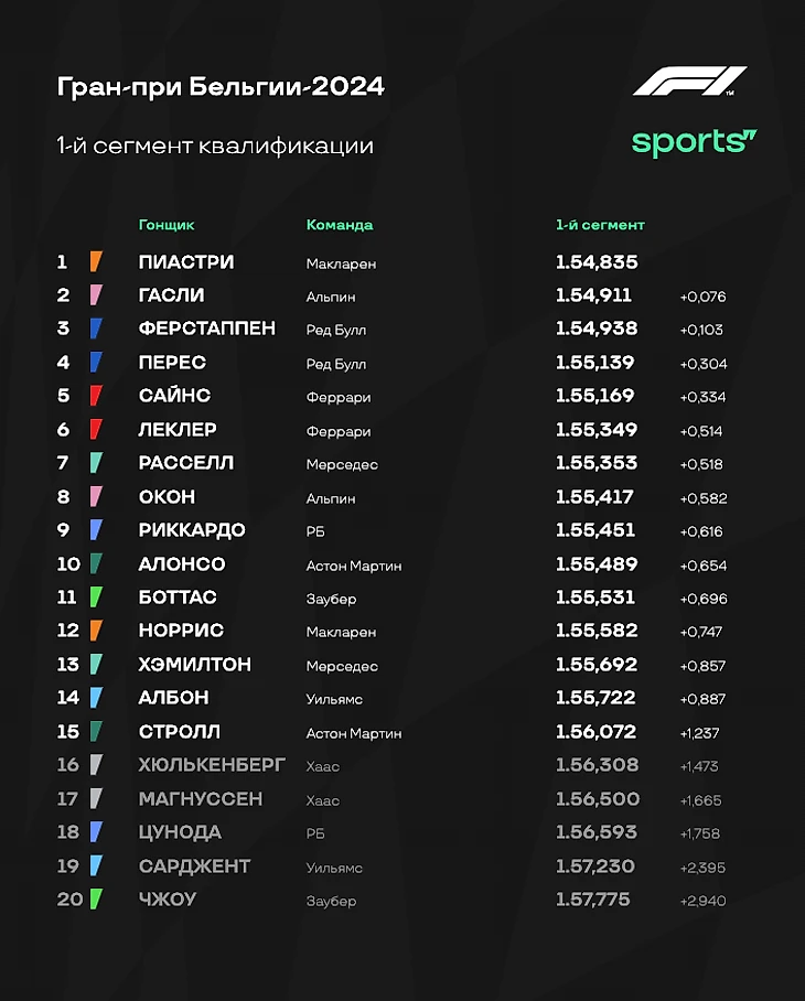 В итоге лучшее время у Пиастри. Дальше расположились Гасли, Ферстаппен, Перес, Сайнс и Леклер.