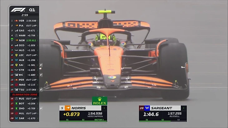 Многие жалуются на очень низкий уровень сцепления с трассой. По окончании первой попытки впереди Ферстаппен, Пиастри, Леклер и Перес. В зоне вылета: Сарджент, Стролл, Боттас, Албон и Чжоу.