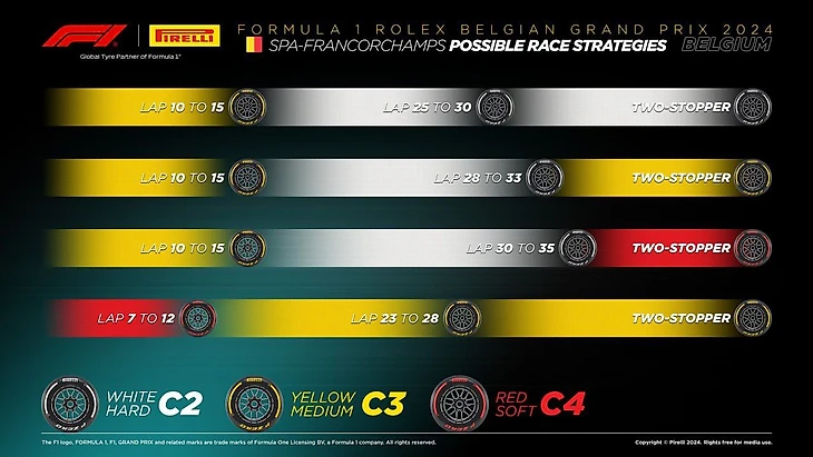 «Пирелли» полагает, что оптимальный вариант на гонку - тактика с двумя пит-стопами (причем во всех случаях, одной остановки шинники не предвидят). Самой быстрой назвали стратегию с двумя «хардами». Интересно, так ли это, ведь у «Ред Булл» (что у Переса, что у Ферстаппена) осталось только по одному комплекту самых жестких шин. Возможно, «быкам» придется выкручиваться. Или рассчитывать на темп болида - может, в Бельгии былая скорость наконец вернется к RB20.