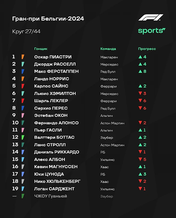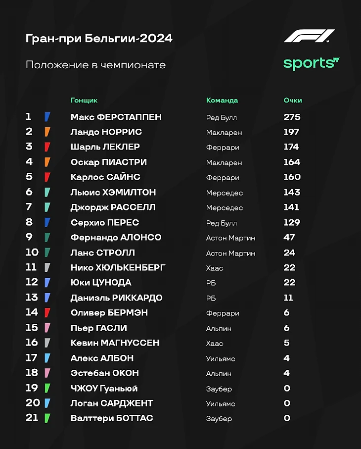 - Заслуженная победа «Мерседеса». Команда выжала максимум во всех смыслах - и на трассе, и на пит-стопах. Отдельно стоит отметить выступление Джорджа Расселла: №63 определил исход гонки, когда предложил команде рассмотреть вариант с одним пит-стопом. «Мерседес», очевидно, согласился со своим пилотом - и стратегия оправдала себя. - «Макларен» был быстрейшим по чистому темпу, но не смог реализовать это преимущество. Команда ошибалась со стратегией, да и пилоты местами не смогли выжать максимум из болида. Порой мешали и помарки гонщиков: к примеру, просчет Пиастри на втором пит-стопе явно оказался ключевым для результатов гонки. - «Ред Булл» и «Феррари» страдали. «Быкам» катастрофически не хватало темпа на прямых, в то время как «Феррари» просто комплексно смотрелась слабее «Макларена» и «Мерседеса». Обоим коллективам явно есть чем заняться на протяжении летнего перерыва. - «Второй дивизион» сегодня практически выпал из зоны внимания: давно не было столь интересно наблюдать за борьбой лидеров. В итоге стоит отметить, что Фернандо Алонсо удалось урвать два очка за девятое место, в то время как десятое забрал Эстебан Окон - что для «Астон Мартин», что для «Альпин» это важные очки. - Напоследок подчеркнем регресс «Хааса». «Спа» явно не подошла американской команде: сегодня Хюлькенберг и Магнуссен были похожи на груши для битья. И это после пары весьма удачных выступлений, когда Нико набирал больше очков, чем Перес из «Ред Булл». Нужно исправляться. Теперь остается только ждать следующей гонки - до которой почти месяц, ведь «Ф-1» уходит на летний перерыв. Так что встретимся на Гран-при Нидерландов, который пройдет с 23 по 25 августа!