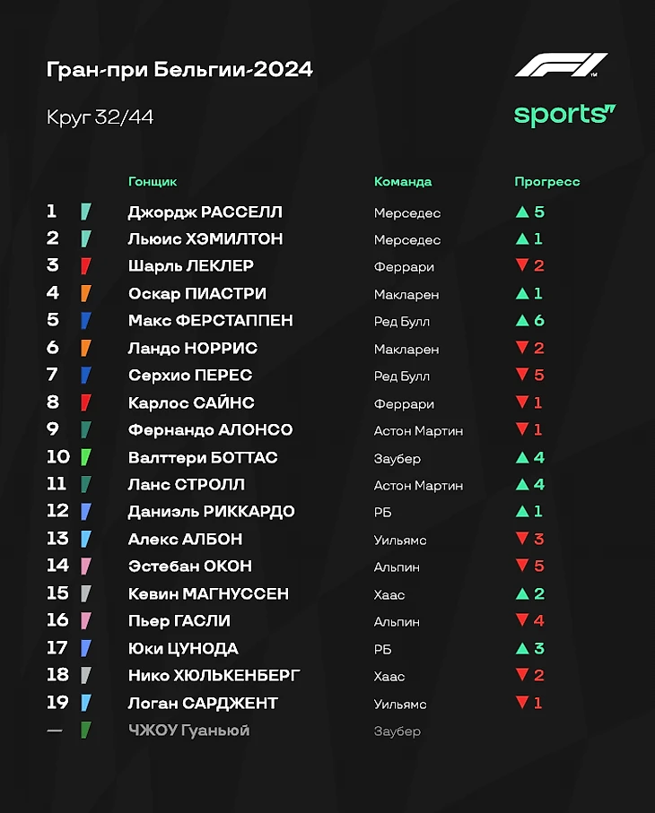 Расселл - лидер, но Хэмилтон в 1,2 секунды позади (причем у Льюиса более свежие шины). Макс, Ландо и Шарль бьются за четвертое место. «Макларен» рассчитывает на то, что Пиастри сможет приблизиться к «Мерседесам».