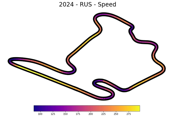 Визуализируем распределение скорости Джорджа Расселла, установившего быстрейший круг на Гран-при Венгрии, на этом самом круге.
