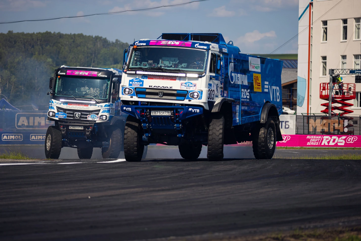 На втором этапе RDS GP 2023 в Нижнем Новгороде с шоу-заездами выступили многократные чемпионы ралли «Дакар» и «Шелковый путь», Эдуард Николаев и Антон Шибалов, которые продемонстрировали парный дрифт на раллийных грузовиках «КАМАЗ-Мастер». Съемочная команда вплоть до этапа монтажа не понимала, как это можно использовать в «Шинной борьбе». Но в итоге сцена с «КАМАЗами» отлично подошла для объяснения, как большой вес автомобиля влияет на инерцию при дрифте. Это помогло зрителю разобраться с тем, как кинематика движения разновесных авто влияет на спортивный результат.