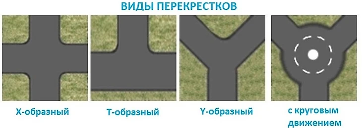 Крестовидный: наиболее распространенный вариант, формирующийся при пересечении двух дорог под прямым углом. Характеризуется четырьмя векторами движения и, как правило, наличием светофорных объектов или знаков приоритета.