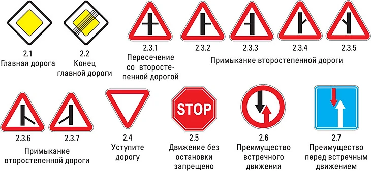 Второстепенная дорога: знаки 2.4 «Уступите дорогу» и 2.5 «Движение без остановки запрещено» обязывают водителя предоставить преимущество всем транспортным средствам, следующим по главной дороге.
