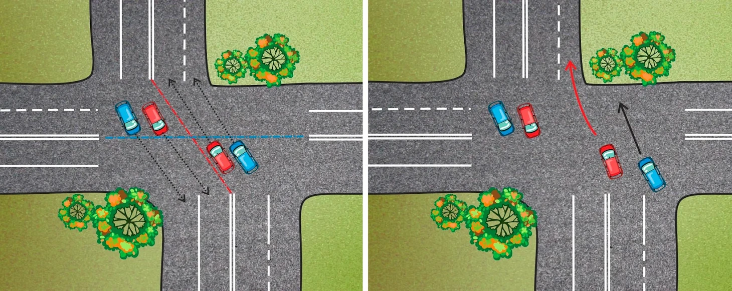 Завершение маневра: водитель, заканчивающий маневр на перекрестке при включении запрещающего сигнала, должен освободить зону пересечения, не создавая помех другим участникам.