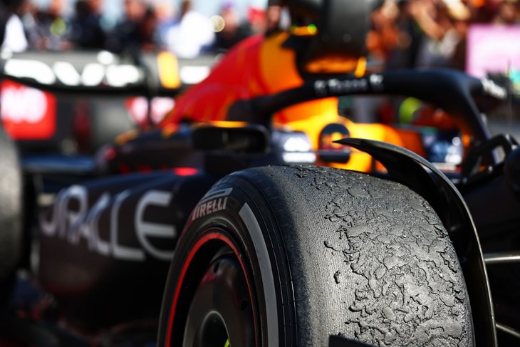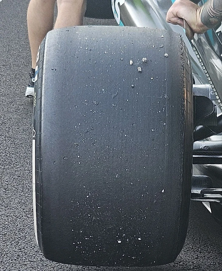 А Расселл выкатал покрышки практически до основания – видите, как просматривается решетка корда?