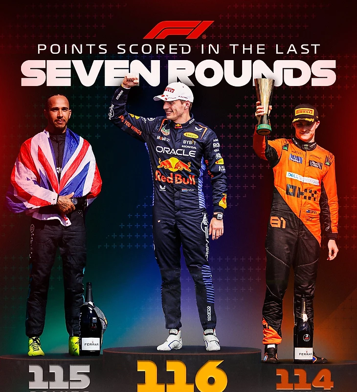 «Формула-1» в 2024-м удивляет суперконкуренцией: помимо Макса Ферстаппена, Гран-при выигрывали еще 6 пилотов «Макларена», «Феррари» и «Мерседеса». А в последних 4 гонках «Ред Булл» вообще не побеждал – только поднимался на подиумы. За последние 7 этапов набранные очки наглядно демонстрируют, насколько же уравнялся пелотон: