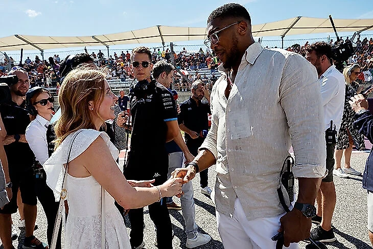 Энтони Джошуа также, как и Макилрой, прибыл на Гран-при США 2023 года и полностью вошел в новую роль совладельца «Альпин»: встречал гостей.