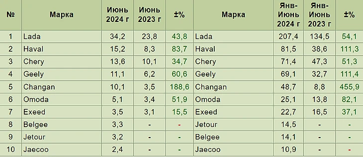 Наибольший рост продаж среди китайских брендов демонстрирует GAC, продажи которого увеличились более чем в 60 раз. Tank также показывает впечатляющую динамику, увеличив продажи в 51 раз в первом квартале 2024 года. Лидером среди китайских марок остается Haval, продажи которого выросли на 125% (37,5 тыс. шт.). Второе и третье места занимают Chery (+74%, 33 тыс. шт.) и Geely (+130%, 29,1 тыс. шт.) соответственно.