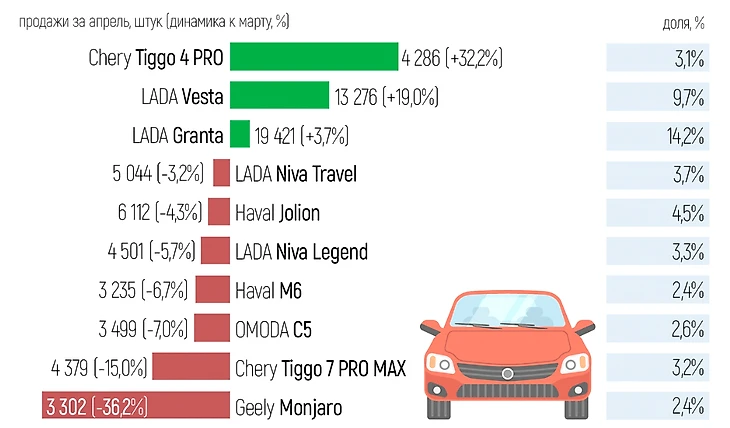 Первые три строчки рейтинга самых продаваемых автомобилей по-прежнему занимают модели Lada: Granta, Niva и Vesta. При этом Vesta показала впечатляющий 30-кратный рост продаж по сравнению с прошлым годом, хотя и с низкой базой. Ожидается, что с появлением версий с автоматической трансмиссией Vesta поднимется еще выше в рейтинге, возможно, даже обогнав Niva.