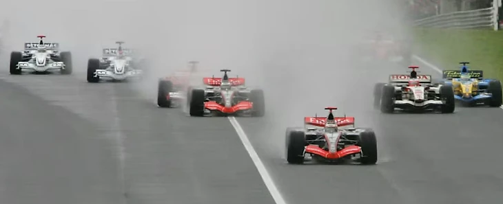 Тем временем Дженсон был в своей стихии на мокрой трассе. Он был 11-м в конце первого круга, девятым после 2-го, восьмым на следующем круге после того, как обогнал Дэвида Култхарда, затем седьмым после того, как обогнал Фелипе Массу на 4-м круге.