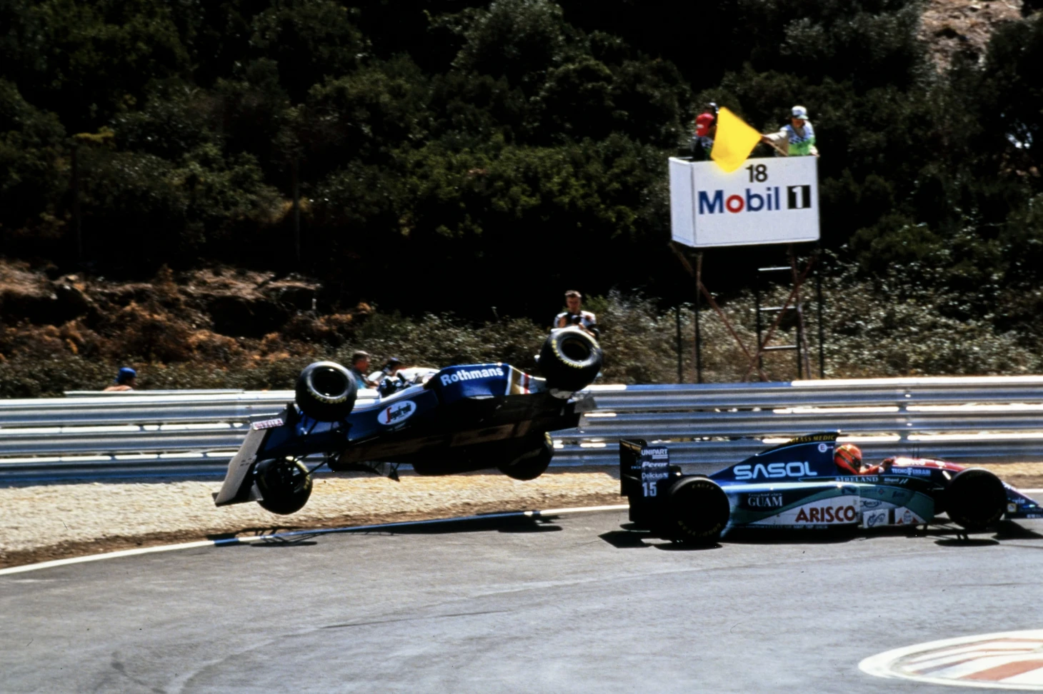 Последней ошибкой Ирвайна стала случайность с неприятными последствиями. Когда машина Ирвайна подъехала к повороту задним ходом, Хилл, который до этого развернулся, оказался рядом. Он попытался объехать «Джордан», который всё ещё двигался назад, но машины соприкоснулись колёсами, и «Уильямс» взлетел в воздух, перевернувшись на каркас безопасности.