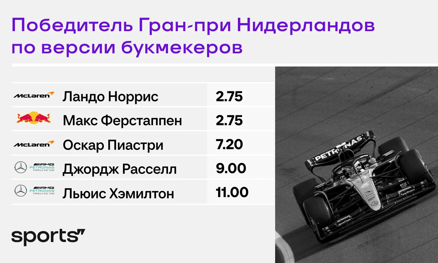 За победу в гонке на трассе «Зандворт» сразятся Ферстаппен и Норрис. Однозначного фаворита нет – на обоих выставлены кэфы 2.75. Третьим претендентом на первое место котируется Пиастри – 7.20.