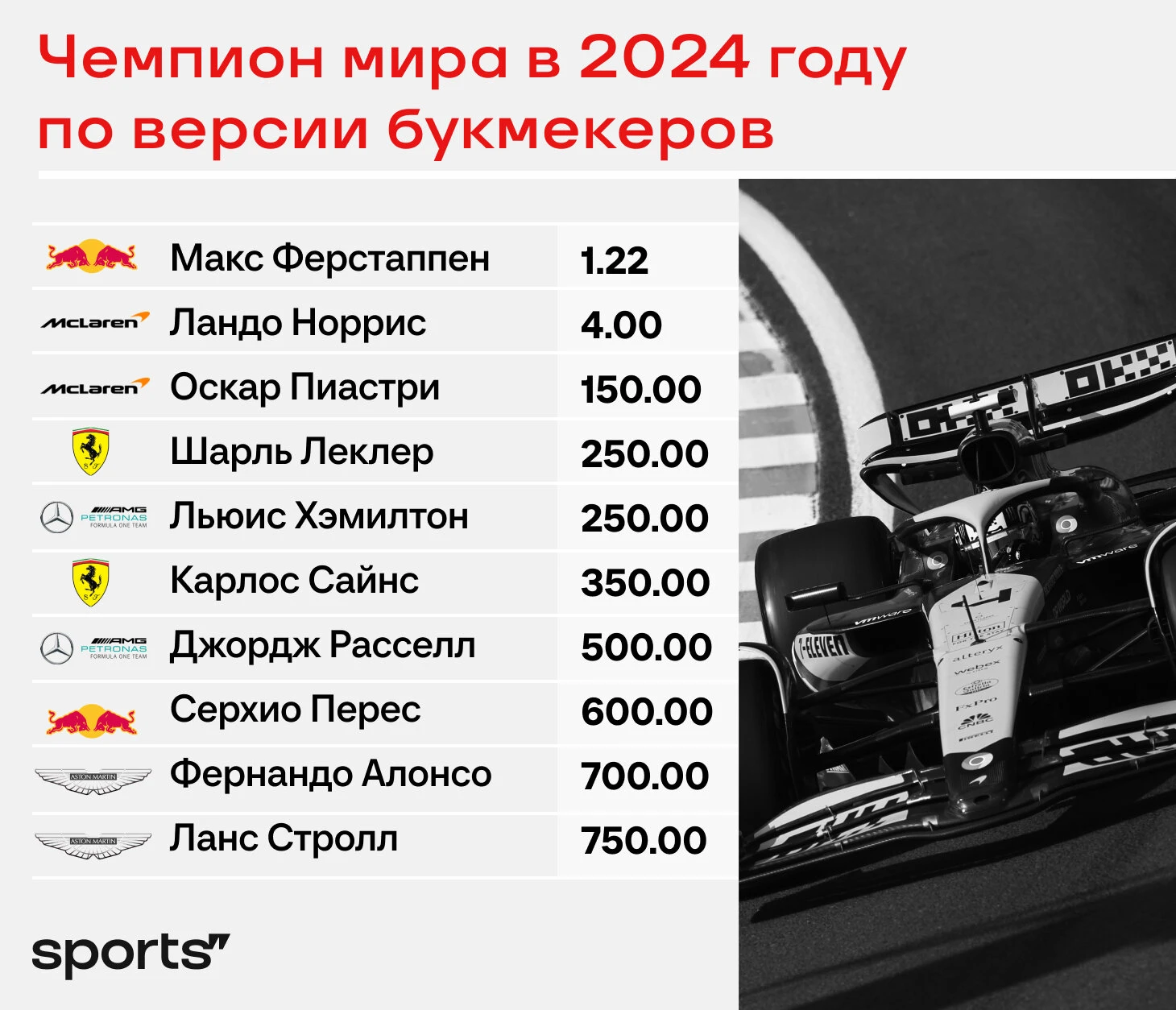 Ферстаппен лидирует в личном зачете и опережает ближайшего преследователя на 78 очков. Букмекеры уже видят его четырехкратным чемпионом мира и дают на это коэффициент 1.22.