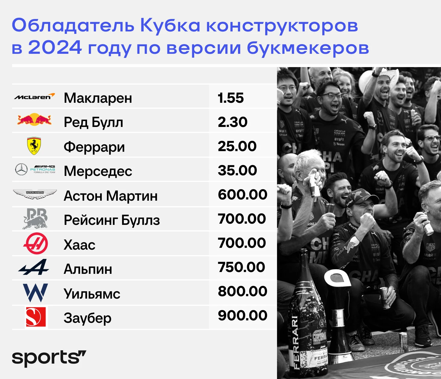Если брать прогноз на то, пилот какой команды выиграет гонку, то букмекеры верят, что больше перспектив у гонщиков «Макларен». Кэф на это 2.05. Совсем рядом «Ред Булл» за 2.55.