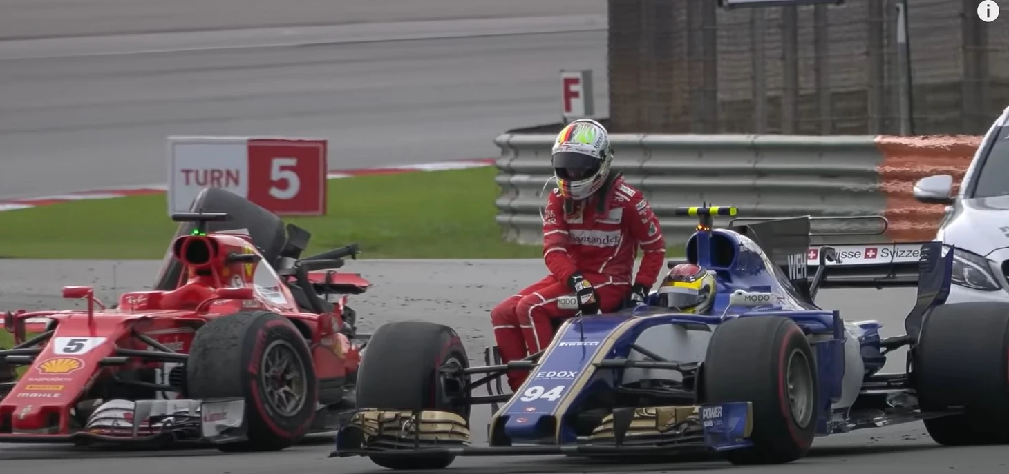 После финиша гонки в Малайзии Себастьян Феттель и Ланс Стролл медленно проходили пятый поворот трассы «Сепанг», гонщик «Феррари» был на внешней стороне, а новичок «Уильямса» на внутренней, их траектории пересеклись, и гонщики странным образом столкнулись.