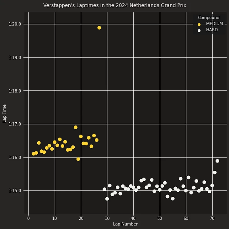По оси х отложены круги гонки, по у - время гонщика. Цвет кружочка отражает типы шины: желтый - медиум, белые - хард.
