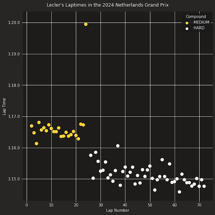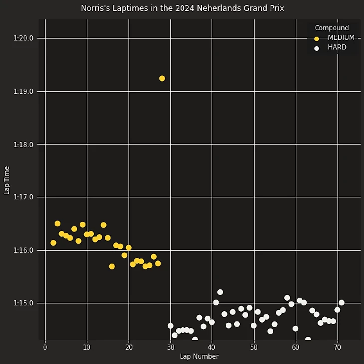 Нанесем на график время прохождения круга призеров Гран-при Голландии 2024 Ландо Норриса (победителя), Макса Ферстаппена (занявшего второе место) и Шарля Леклера (занявшего третье место) в гонке с учетом типа шин.