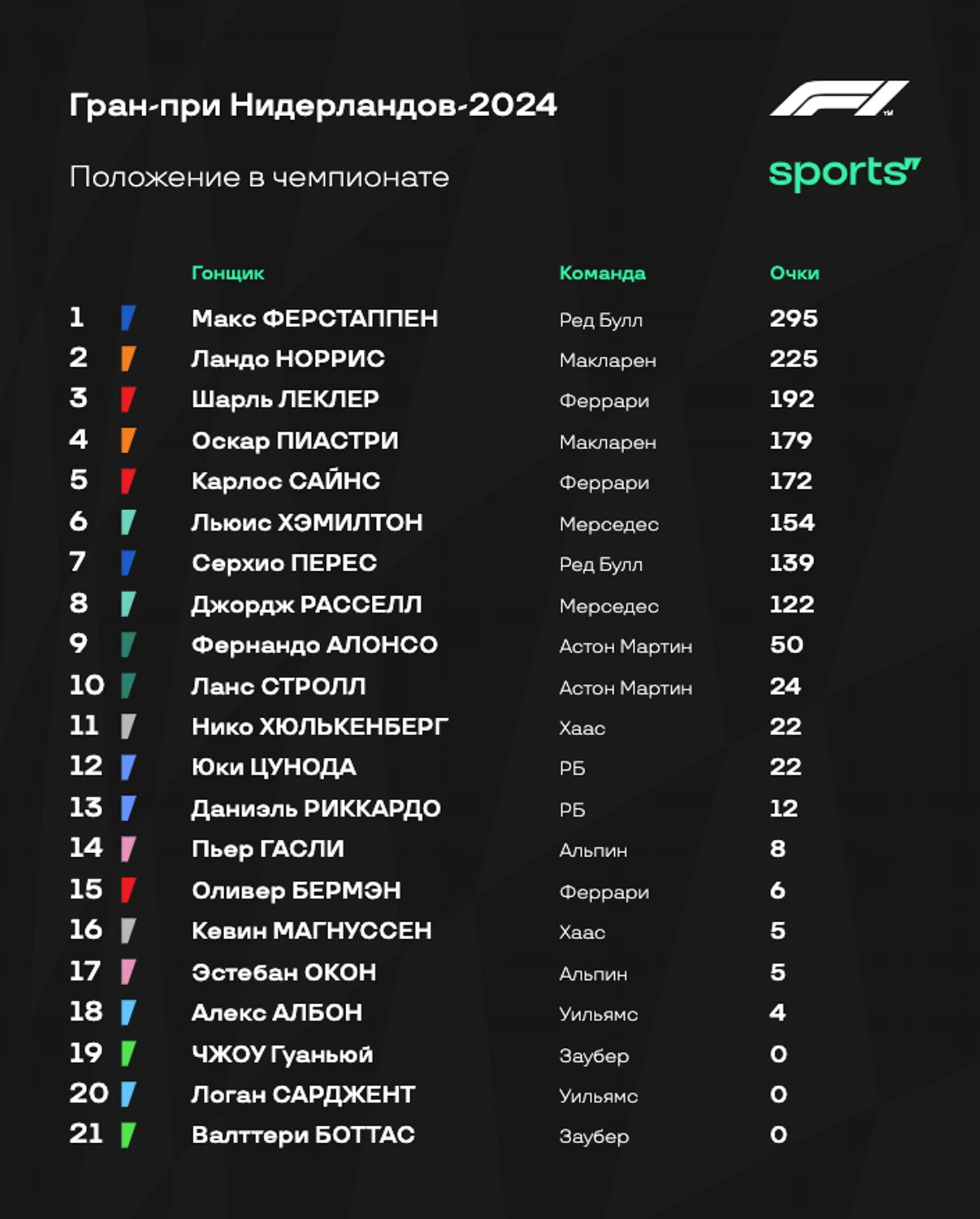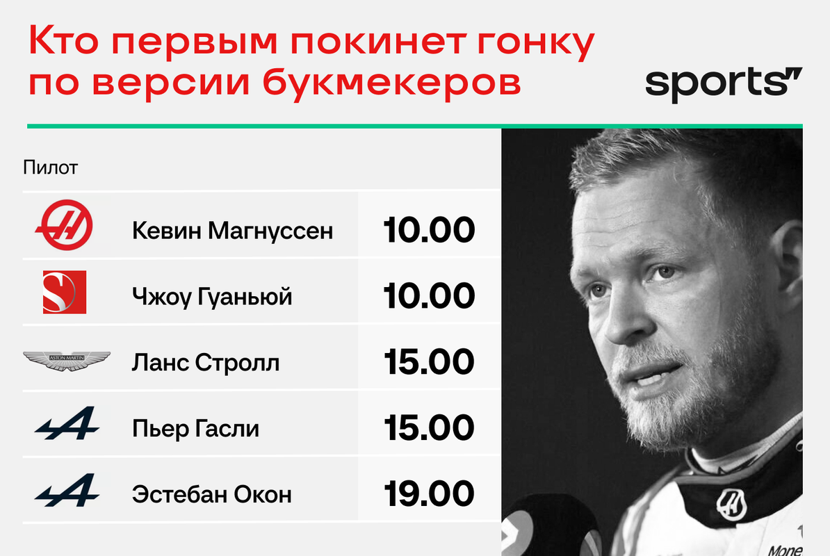 По прогнозам букмекеров, первым с трассы сойдет или Кевин Магнуссен, или Чжоу Гуаньюй. Обоих наградили кэфом 10.00. Столько же давали на Логана Сарджента, но 27 августа стало известно, что он потерял место в команде после этапа в Нидерландах. Гонщик 9 раз не доехал до финиша в 36 гонках и заработал всего одно очко.