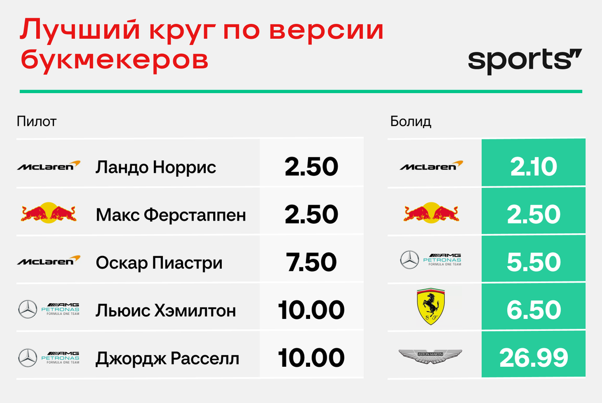 Если с пилотами нелегко, то с командами более-менее понятно. Букмекеры считают, что лучший круг поставит болид из «Макларен». В «Феррари» на домашней трассе верят мало – 6.50.