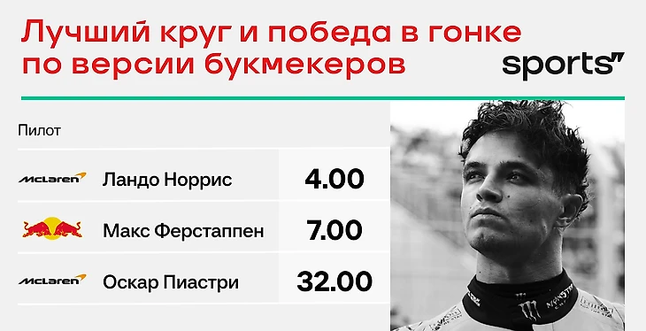 Тут все сложно. На Норриса и Ферстаппена дают одинаковые кэфы – по 2.50. Третьим фаворитом по традиции котируется Пиастри за 7.50.
