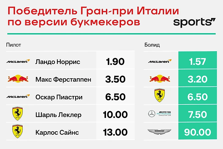 Очевидно, что главными претендентами на победу считаются Норрис и Ферстаппен. На Гран-при Нидерландов однозначного фаворита не было – давали одинаковые коэффициенты на обоих. Но после того, как британец сенсационно разнес всех на домашней гонке Макса, букмекеры отдают ему первое место в Монце за 1.90. Победа Ферстаппена стоит дороже – 3.50. Оскар Пиастри – третий в списке за 6.50.