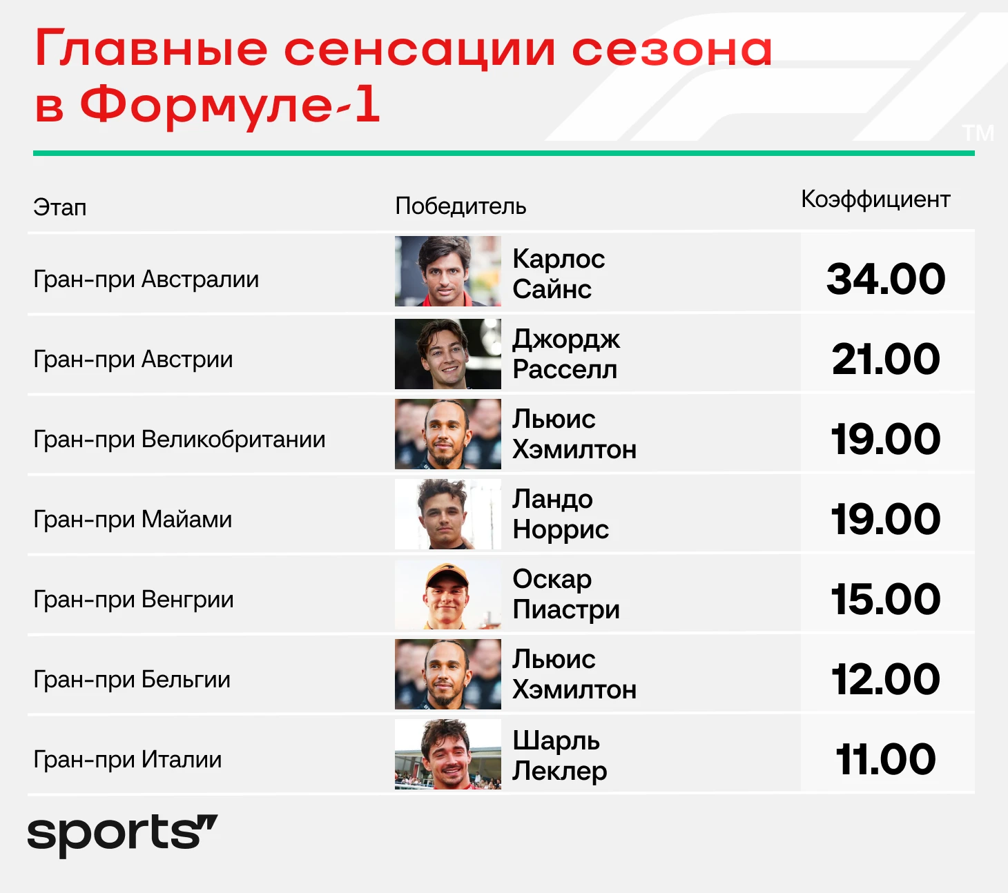 Далее букмекеры промахивались еще шесть раз. В Майами не верили в Ландо Норриса (19.00), в Австрии ставили только пятым в списке фаворитов Джорджа Рассела и, естественно, не давали больше 10% на победу ни в одной из гонок Льюису Хэмилтону. Венгерский прорыв Оскара Пиастри был вероятнее, чем триумф британца на родной трассе. Последняя победа Шарля Леклера также проходит в разряд неожиданностей – букмекеры давали меньше десяти процентов на первое место монегаска.