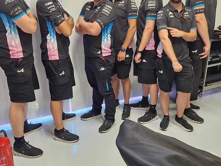 Сотрудники «Альпин» в гараже команды в знак солидарности надели нарукавные повязки Let Us Race − «Дайте нам гоняться».