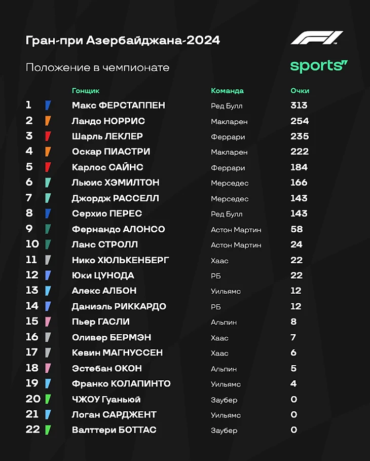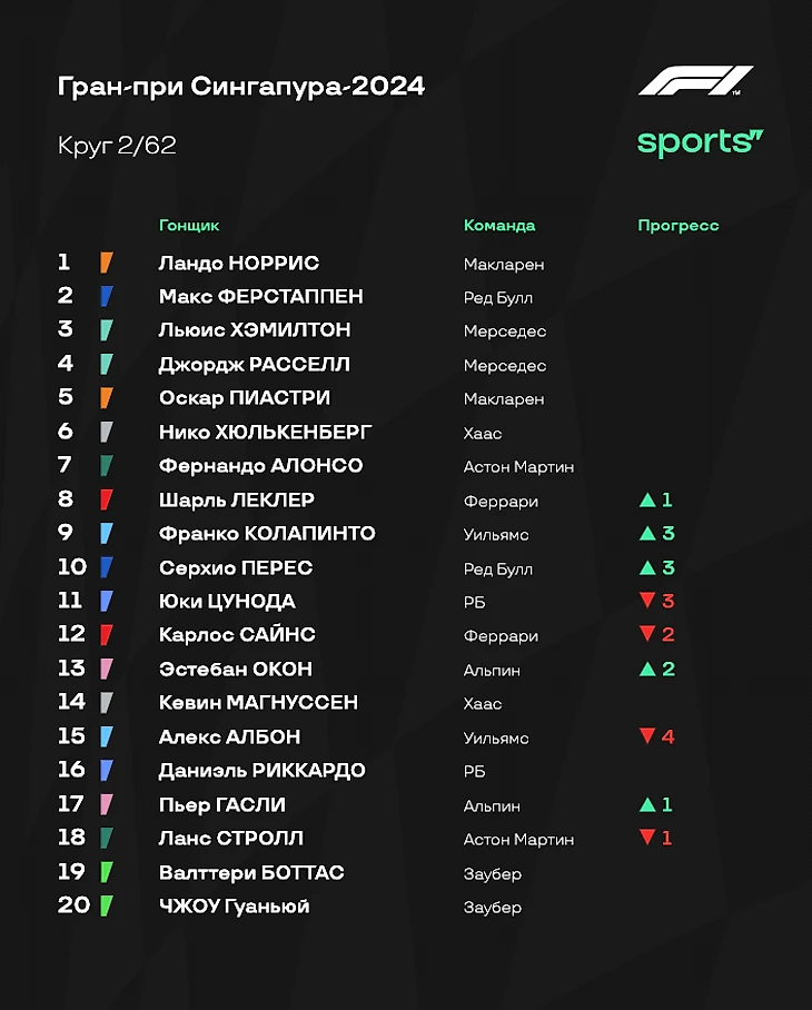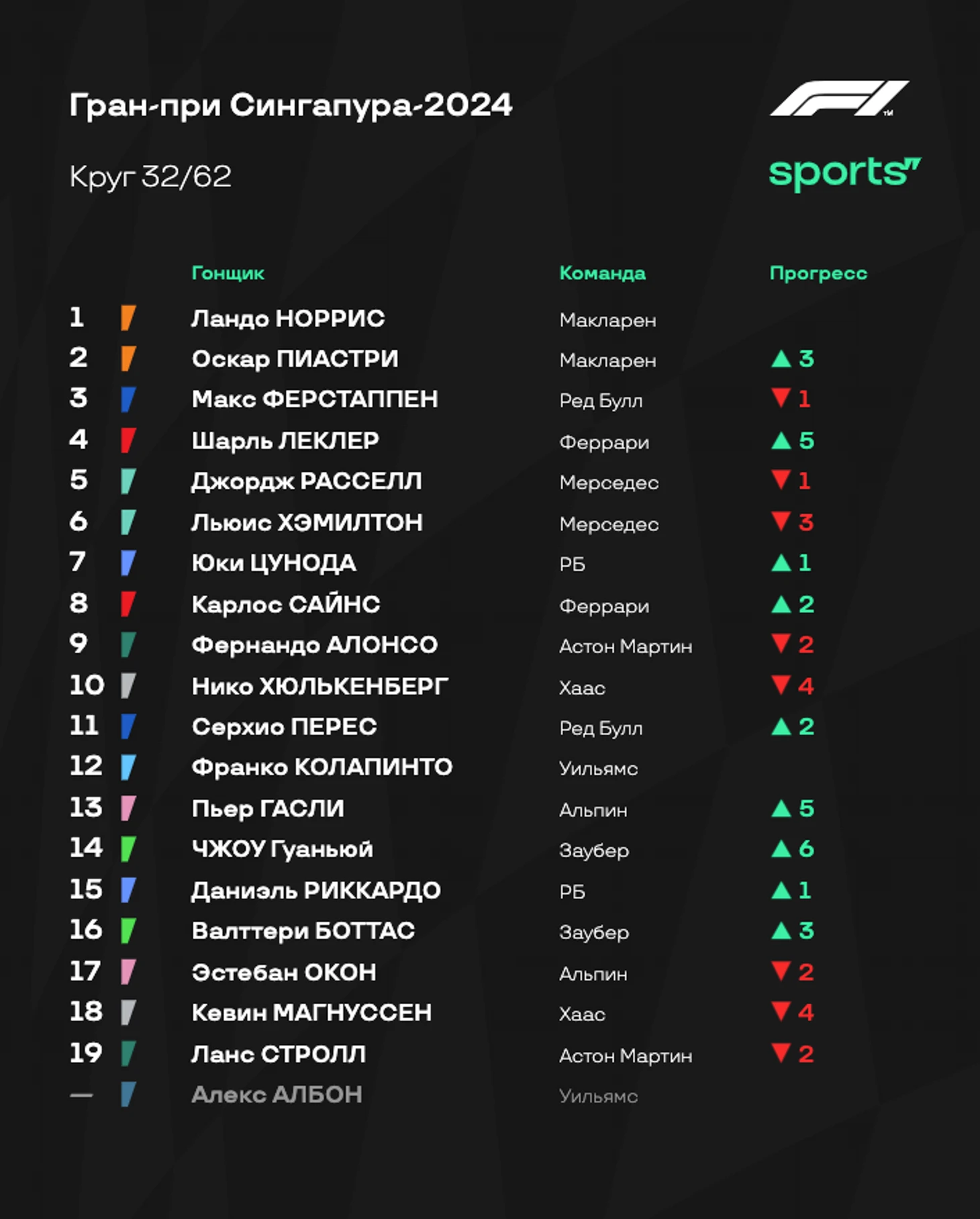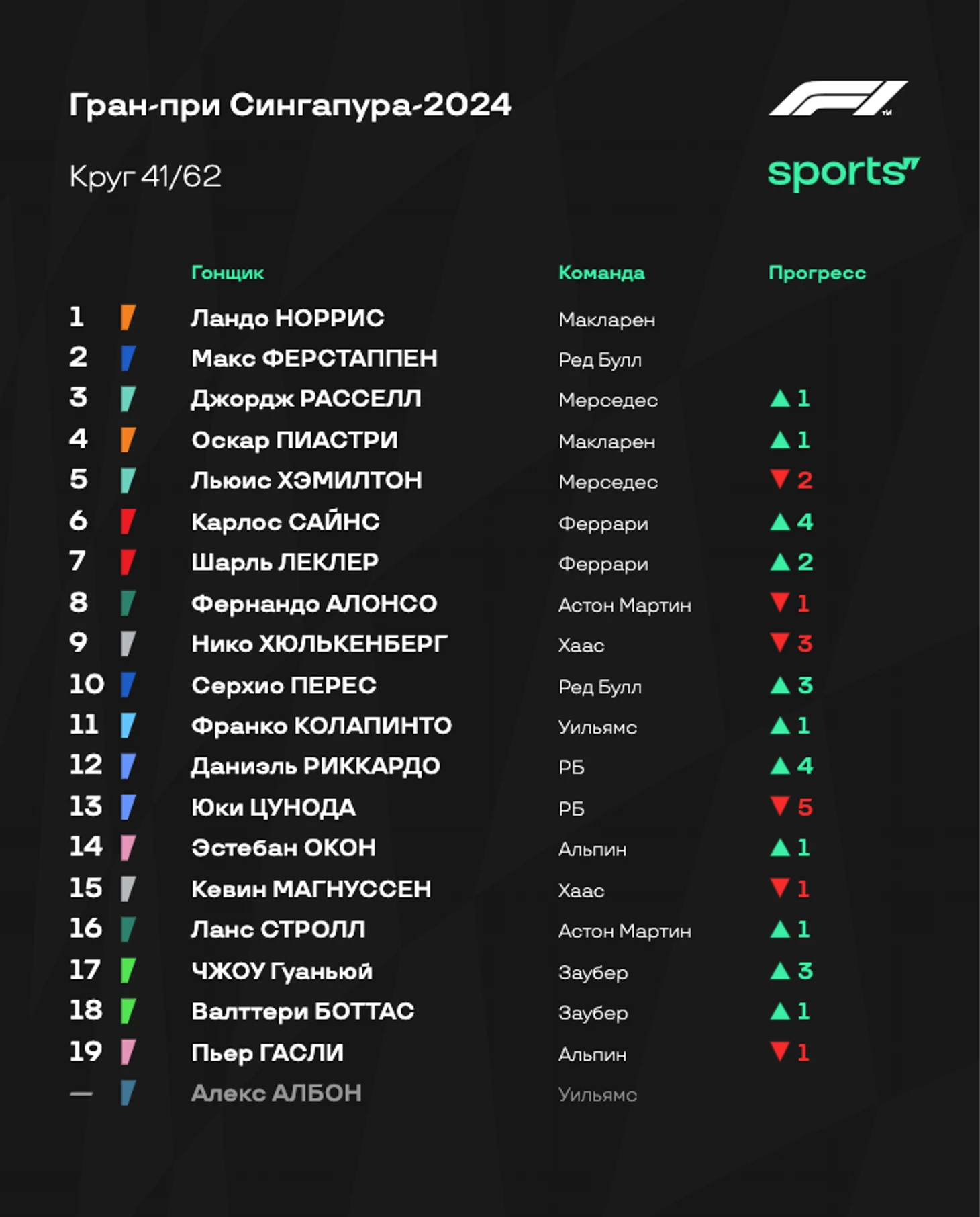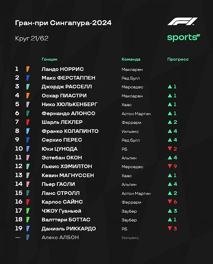 Из других изменений - сильно провалился Албон. Алекс откатился на15-е место. А вот его напарник Колапинто наоборот отыграл 3 позиции и теперь едет 9-м!