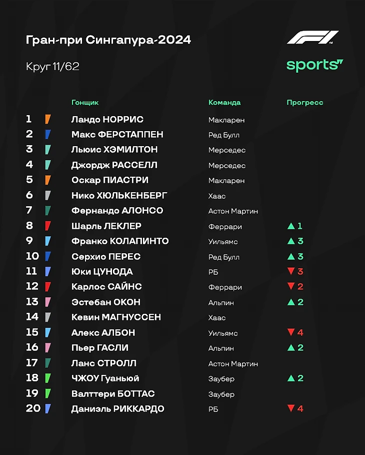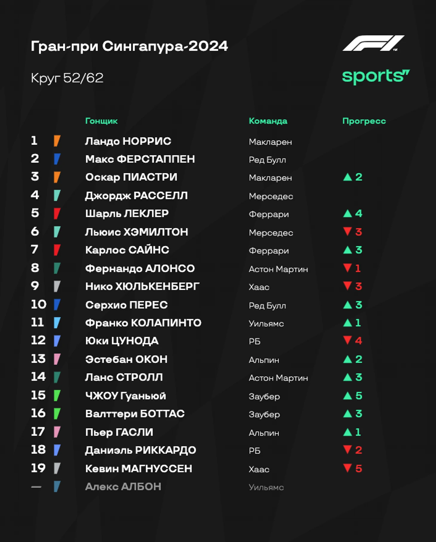 - В «Ред Булл», учитывая то, что трасса в Сингапуре в принципе плохо подходит их машине, а также провал Переса в квалификации, в целом немного минимизировали потери. С поражением в Кубке конструкторов команда, как заяляло руководство, уже смирилось. А с точки зрения борьбы в зачете пилотов сегодня все прошло неплохо. Норрис отыгрывает и Ферстаппена 7 очков, что не так уж много.
