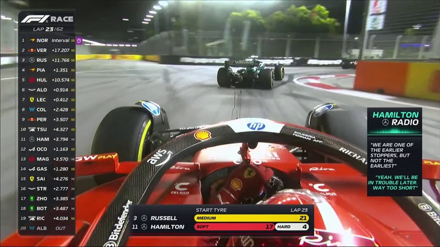 Самое интересное сейчас - это прорывы Леклера и Пиастри и куда ребята смогут добраться на альтернативной стратегии с поздним пит-стопом.