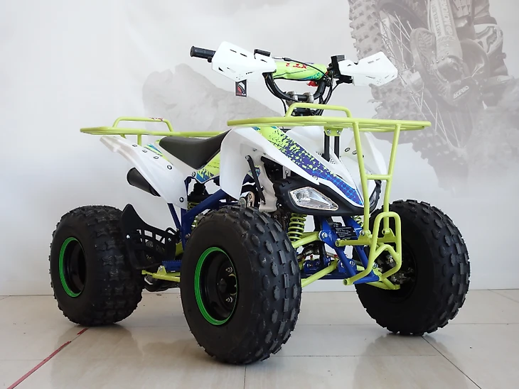 По характеристикам квадроцикл приближен к взрослым моделям. Тут и четырехтактный бензиновый двигатель, и предельная скорость, которая может достигать 60 километров в час, и вес пассажира рассчитан на сто килограммов. Для 15-летнего подростка такой квадроцикл станет отличным подарком. Двигатель неприхотлив и отлично работает на бензине марки АИ-92. Хорошее трение обеспечивают дисковые гидравлические тормоза. Цепной привод ведет на заднюю ось. Колеса резиновые, красоты добавляют металлические штампованные диски.