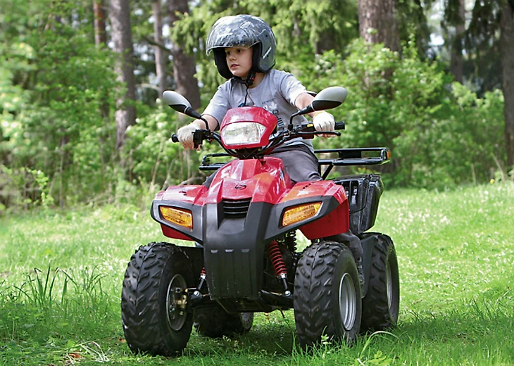 Другой вариант более серьезный и представляет собой полноценное транспортное средство для подростков. Оно с топливным баком и мотором, который работает на бензине. Здесь практически все по-взрослому, квадроциклы рассчитаны на серьезный вес и могут разгоняться до 60 километров в час. Поскольку у нас в стране детям не нужны права для использования квадроциклов, то ездить за рулем такой техники можно до 16 лет, главное, не выезжать на проезжую часть. За городом по пересеченной местности или проселочным дорогам можно кататься сколько угодно, главное при этом, нужно позаботиться о защите: налокотники и наколенники, шлем. Еще лучше, чтобы подобное катание происходило под контролем взрослых.