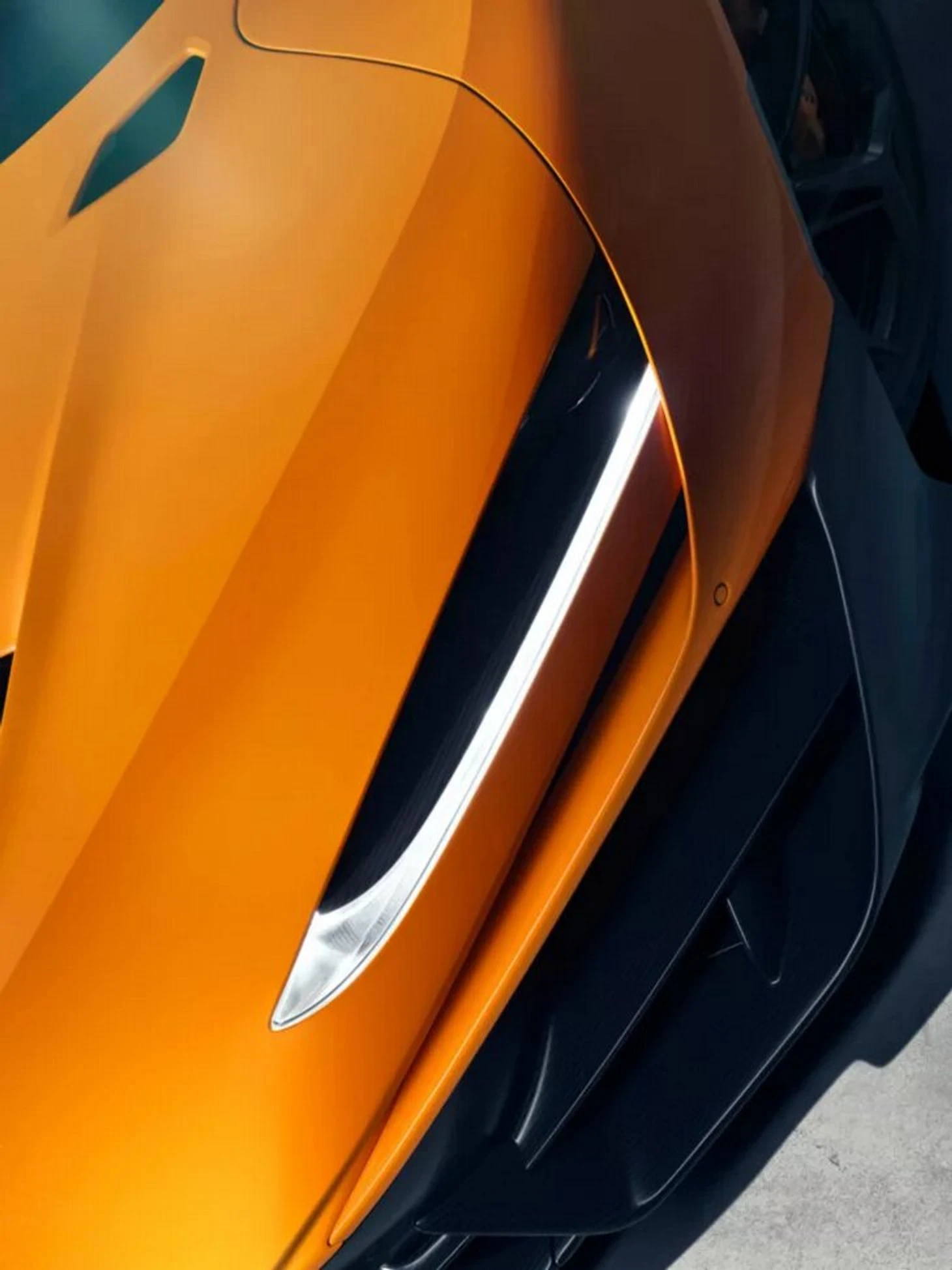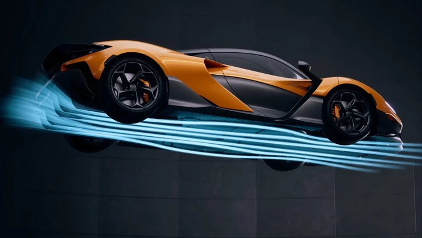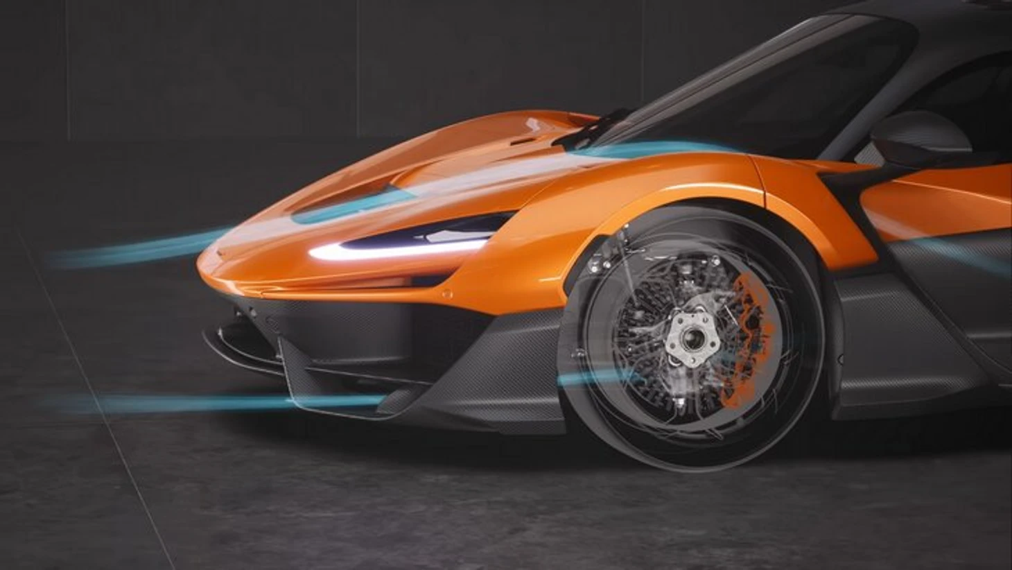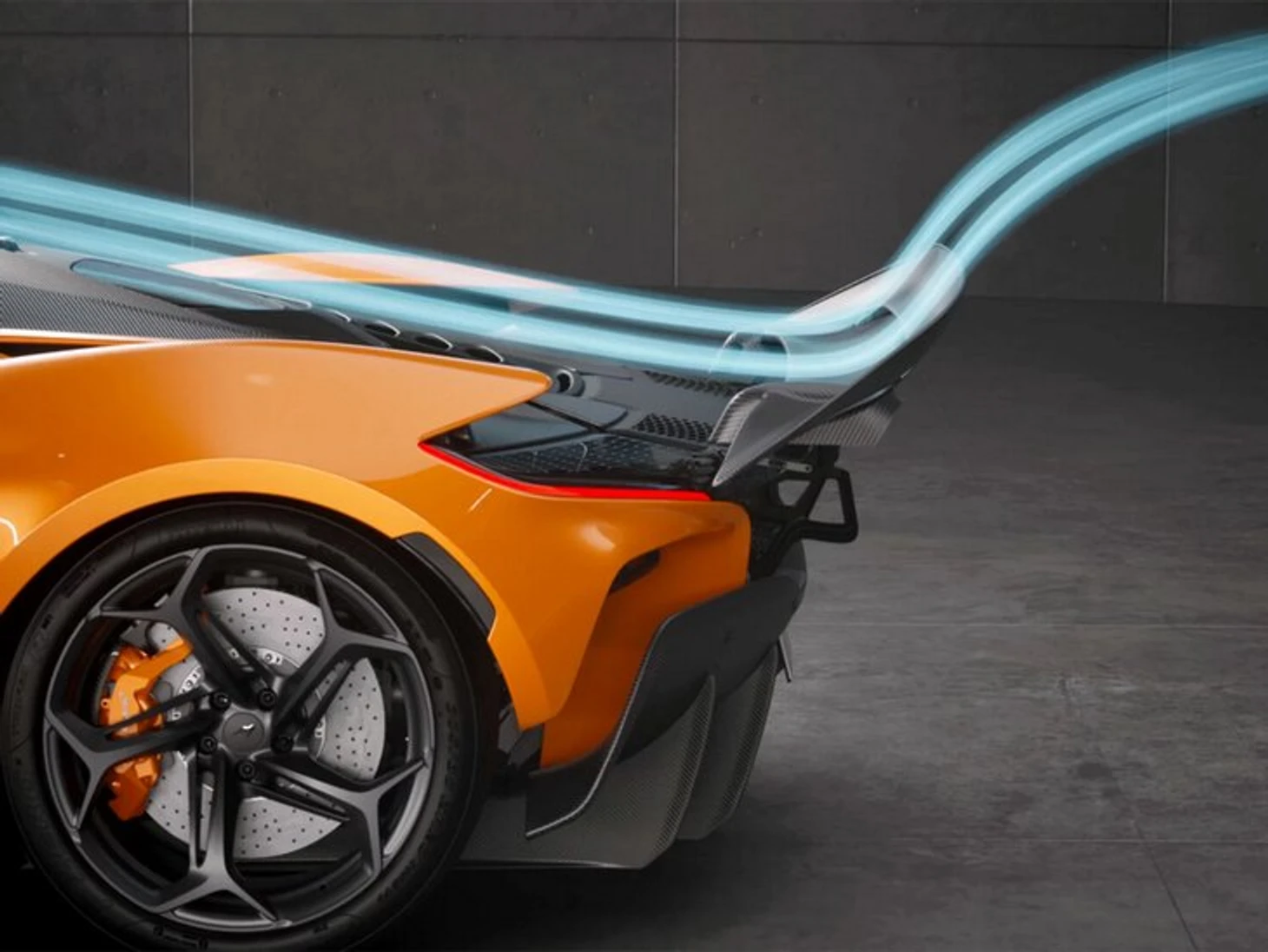 У него очень хитрое переднее крыло, которое, по словам «Макларена», обеспечивает уровень эффективности, сравнимый с задним крылом большинства суперкаров. В гоночным режиме оно использует электронные двигатели без изменения конфигурации: центральная секция направляет воздух вниз к днищу в стиле «Ф-1», а боковые генерируют прижимную силу. При торможении она сбрасывается, обеспечивая дополнительное охлаждение, а также смещая аэродинамический баланс в сторону задней части.
