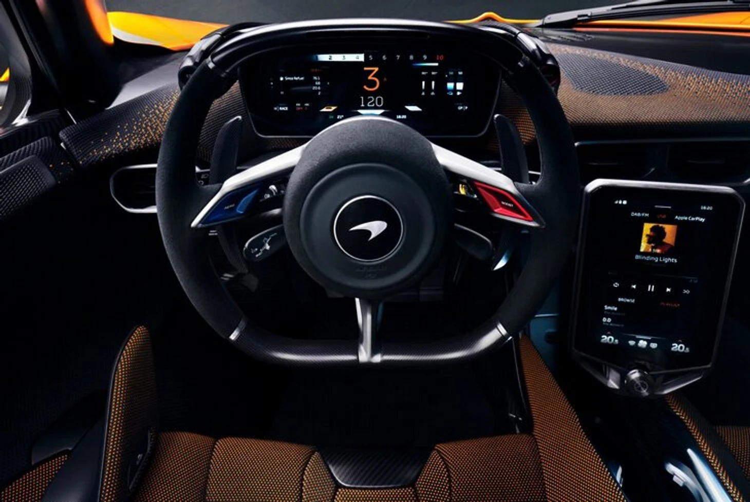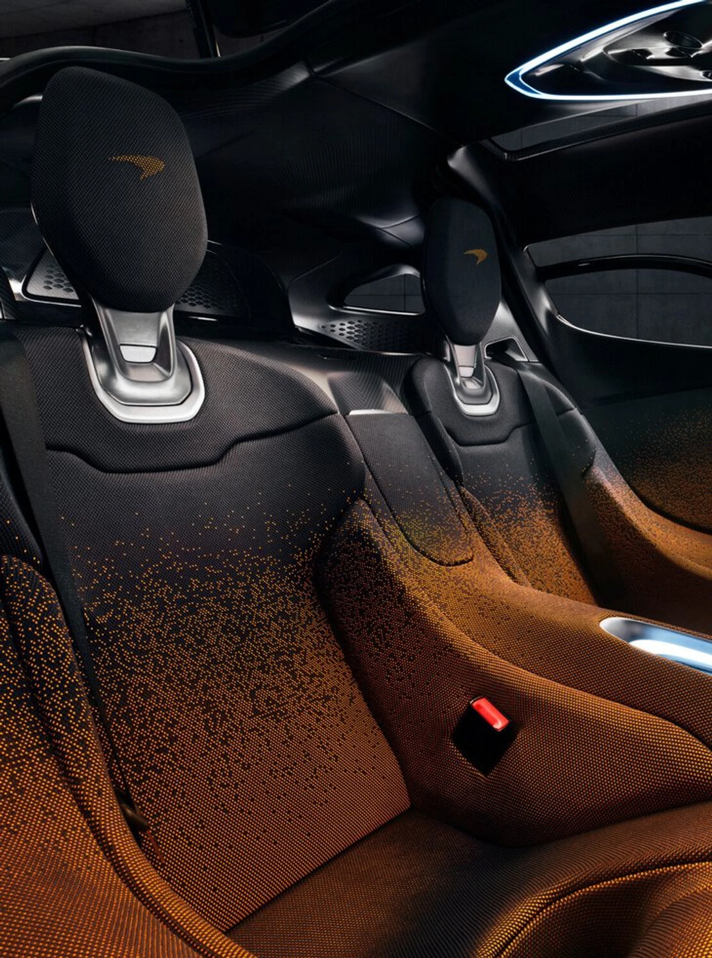 «Макларен» впервые применил в интерьере отделку InnoKnit − сверхлегкий устойчивый материал, который можно окрашивать в разные цвета и интегрировать в него аудиосистему и подсветку.